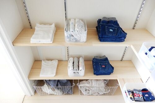 ウォークインクローゼットに家族4人分の衣類を収納しています。オンシーズン用の全ての衣類を、L字型の棚に並べて収納しています。上段が長男用で、下段が次男用。ひと目で、どこに何が収納されているのかわかるので、管理がとーっても楽。